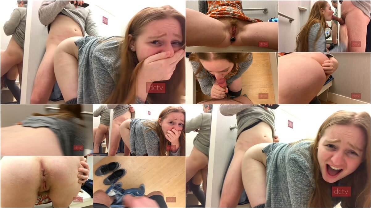 A middle aged guy and younger redhead chick hit the changing rooms in what looks like Macys. She has a small buttplug in already.Blows him a bit and then he puts it in her ass and seems to cum in there, but she takes it out slowly so it does not plop out on the floor.They show the camera over the door a couple times to clearly show it’s real.I cannot tell if she puts the buttplug back in or not, but I assume yes.Girl is not a beauty, but she is still somehow cute.
