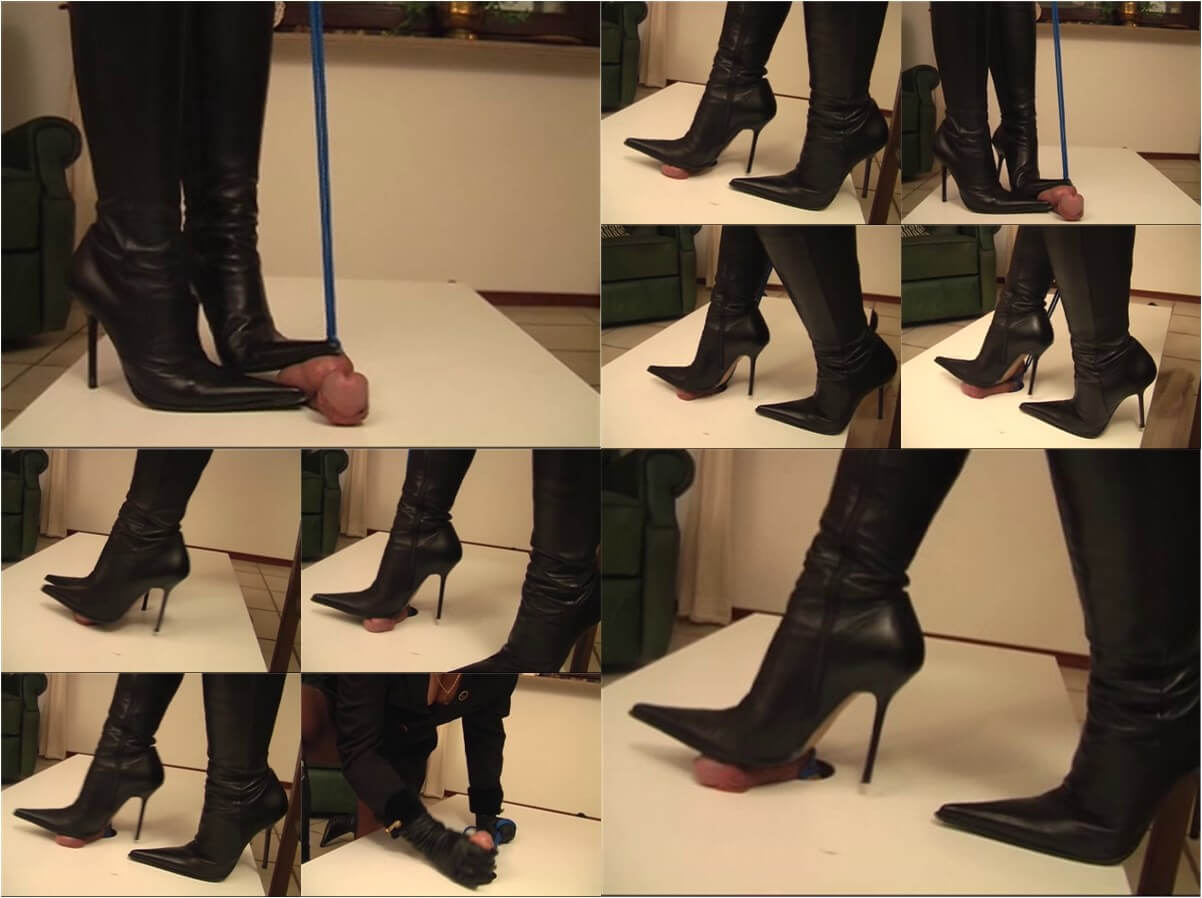 I tease my slave with my new sexy Gianmarco Lorenzi boots. His cock is trapped in my trample table, his wrists and his neck were trapped in a pillory. First i step on my slaves cock, rub it and put it between those sexy boots and tease him. At the end i give him a fast hard handjob with my leathergloves.