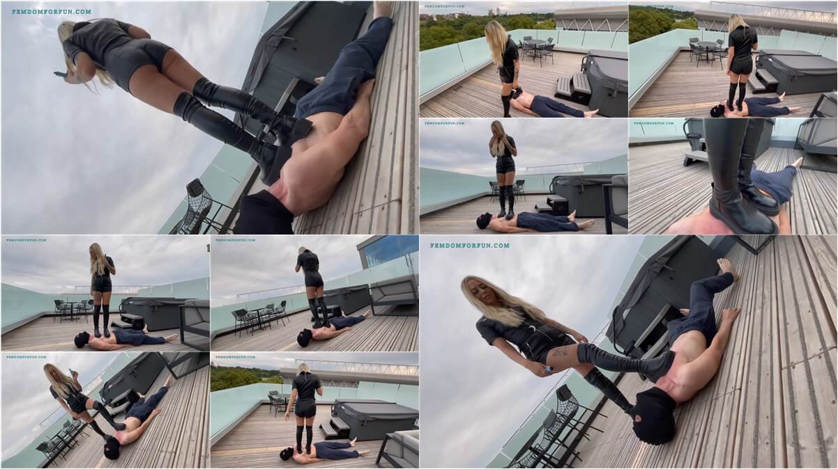 Wearing her favourite over knee leather flat boots she will be trampling the skinny slave against the hard wooden floor. Walking back and forth, standing on him, smoking her vape Goddess K is enjoying her time while the slave is suffering beneath her boots. You can clearly see the boot prints on his chest and stomach pretty much every time after the Goddess steps off him.